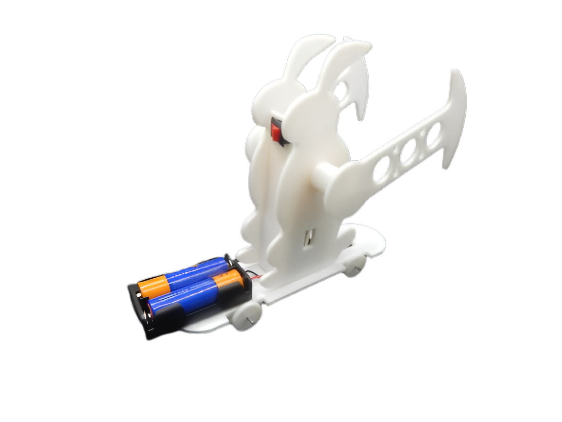 Este kit muestra un conejo moviendo sus brazos para impulsar una patineta, creando un desplazamiento fluido y continuo.