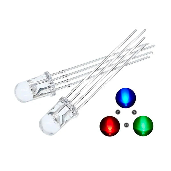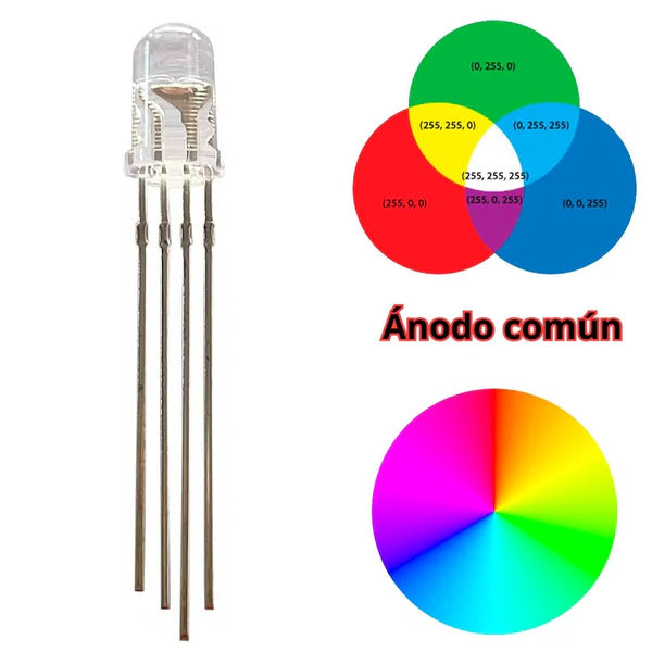 - Ánodo común: En este tipo de LED RGB, los terminales ánodos (positivos) de los tres LED internos (rojo, verde y azul) están conectados juntos, mientras que los terminales cátodos (negativos) están separados.