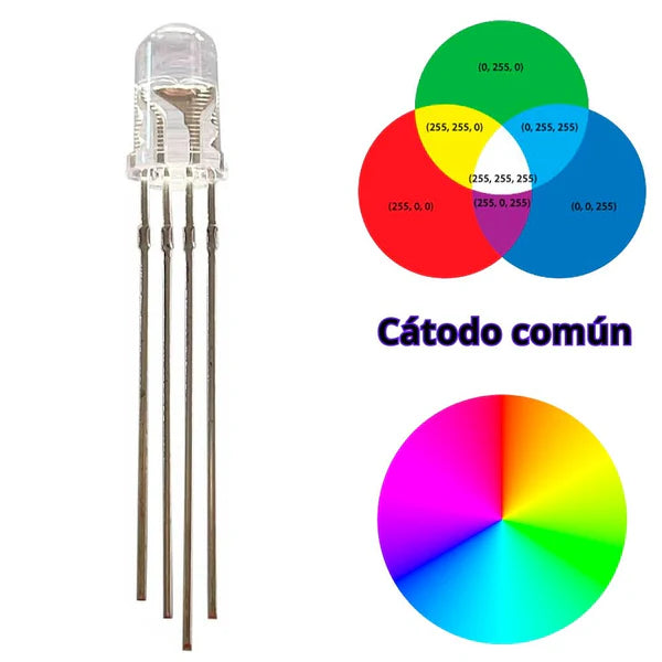 - Cátodo común: En este tipo de LED RGB, los terminales cátodos (negativos) de los tres LED internos (rojo, verde y azul) están conectados juntos, mientras que los terminales ánodos (positivos) están separados.
