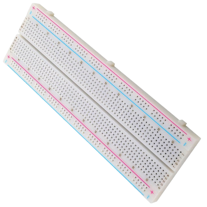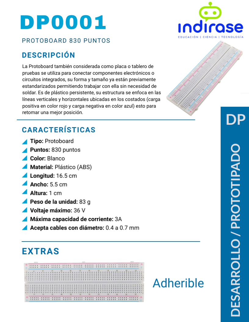 La Protoboard también considerada como placa o tablero de pruebas se utiliza para conectar componentes electrónicos o circuitos integrados, su forma y tamaño ya están previamente estandarizados permitiendo trabajar con ella sin necesidad de soldar. Es de plástico persistente, su estructura se enfoca en las líneas verticales y horizontales ubicadas en los costados (carga positiva en color rojo y carga negativa en color azul) esto para retomar una mejor posición.